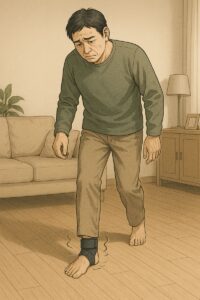 捻挫後や慢性的な足首の不安定感があると、歩行や階段で「グラッ」とした瞬間に痛みや恐怖が出ます。足首サポーターは関節の過度な動きを制限し、靱帯や関節包(関節を包む組織)へのストレスを減らすことで、