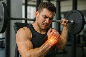手首は単独で働いているわけではなく、肘や肩甲骨と連動して動作を支えています。肩甲骨の固定が弱いとバーの軌道が不安定になり、その補正動作を手首が担うことになります。また、肘関節の安定性が不足すると、重量を支える際に手首に余分な負担が集中し、関節や腱にダメージが生じます。
