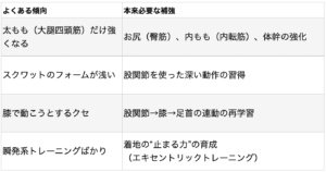 このような**“競技をするための筋力”は育っても、“ケガを防ぐ筋力”が未熟**なままでは、膝への負担は避けられません。