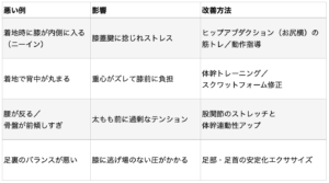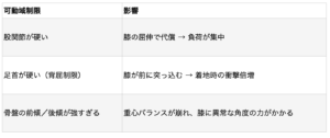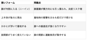 - 筋力のアンバランス:体幹・お尻の筋肉よりも太もも前の筋肉が強くなりがちで、膝への負担が増える
