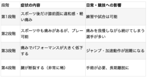 ジャンパー膝は、進行段階によって症状が少しずつ変わっていきます。以下のような4段階モデルで考えられることが多いです。