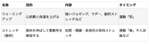 このように、同じ“ストレッチ”でも行うタイミングと方法によって目的がまったく異なります。